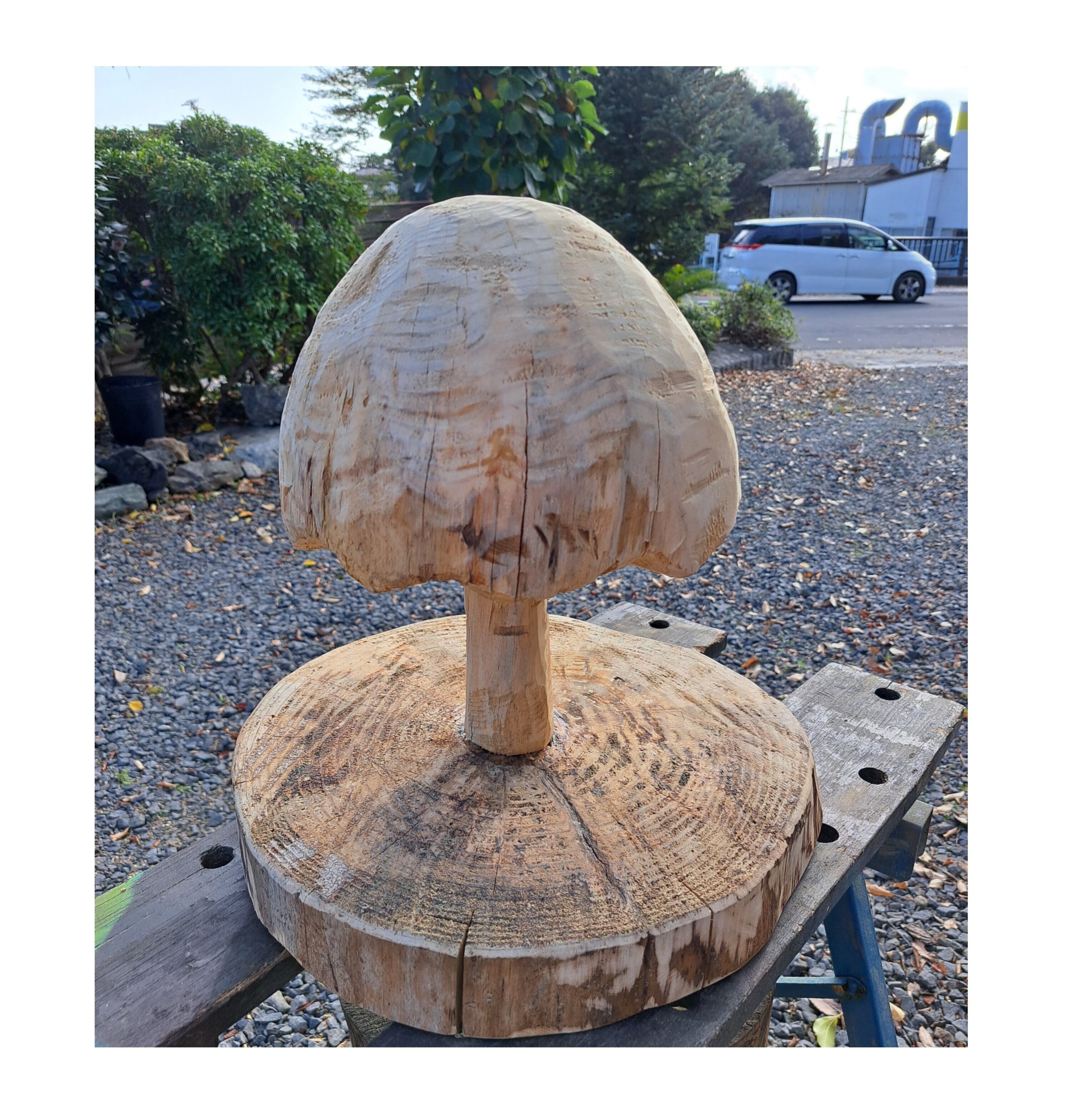 松の丸太をカービングにて削り、グラインダーにて表面を滑らかにし 又エッジ部分も面取りしアクリル画材でペイントしました。