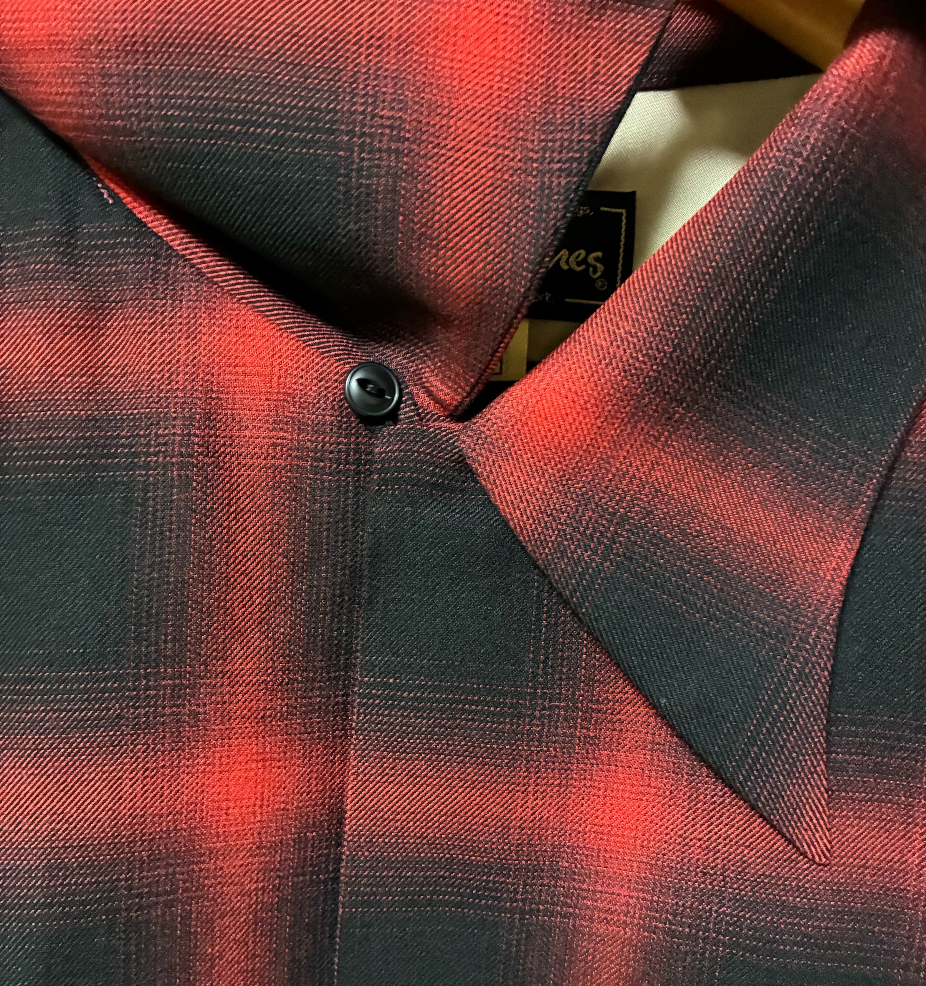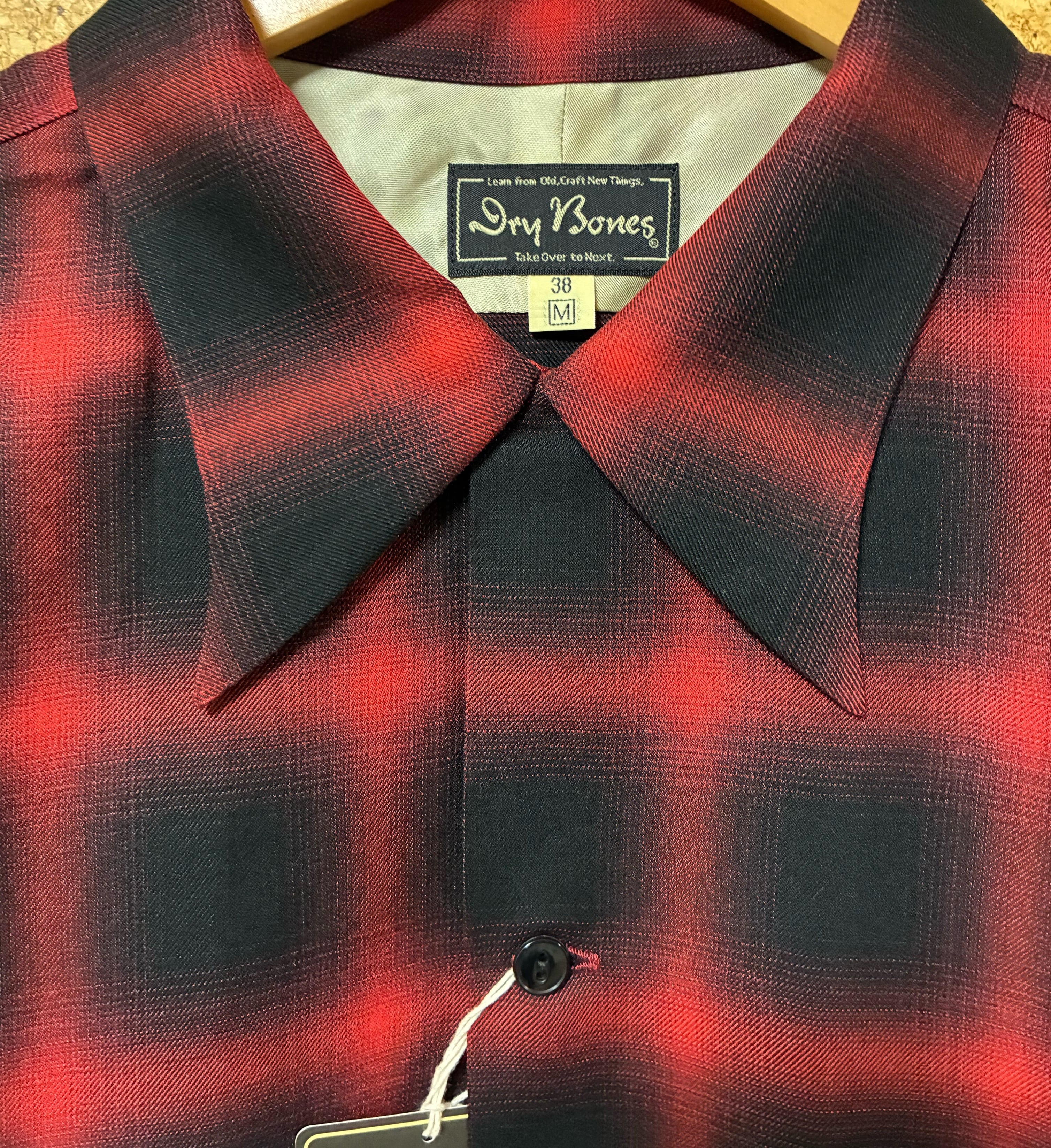 Dry bones製の新作、1950年タイプの大変美しいラインのカラー(襟)、猫目ボタン、肩裏キュプラ、深い色合いのオンブレチェックがクラシックで一生物。