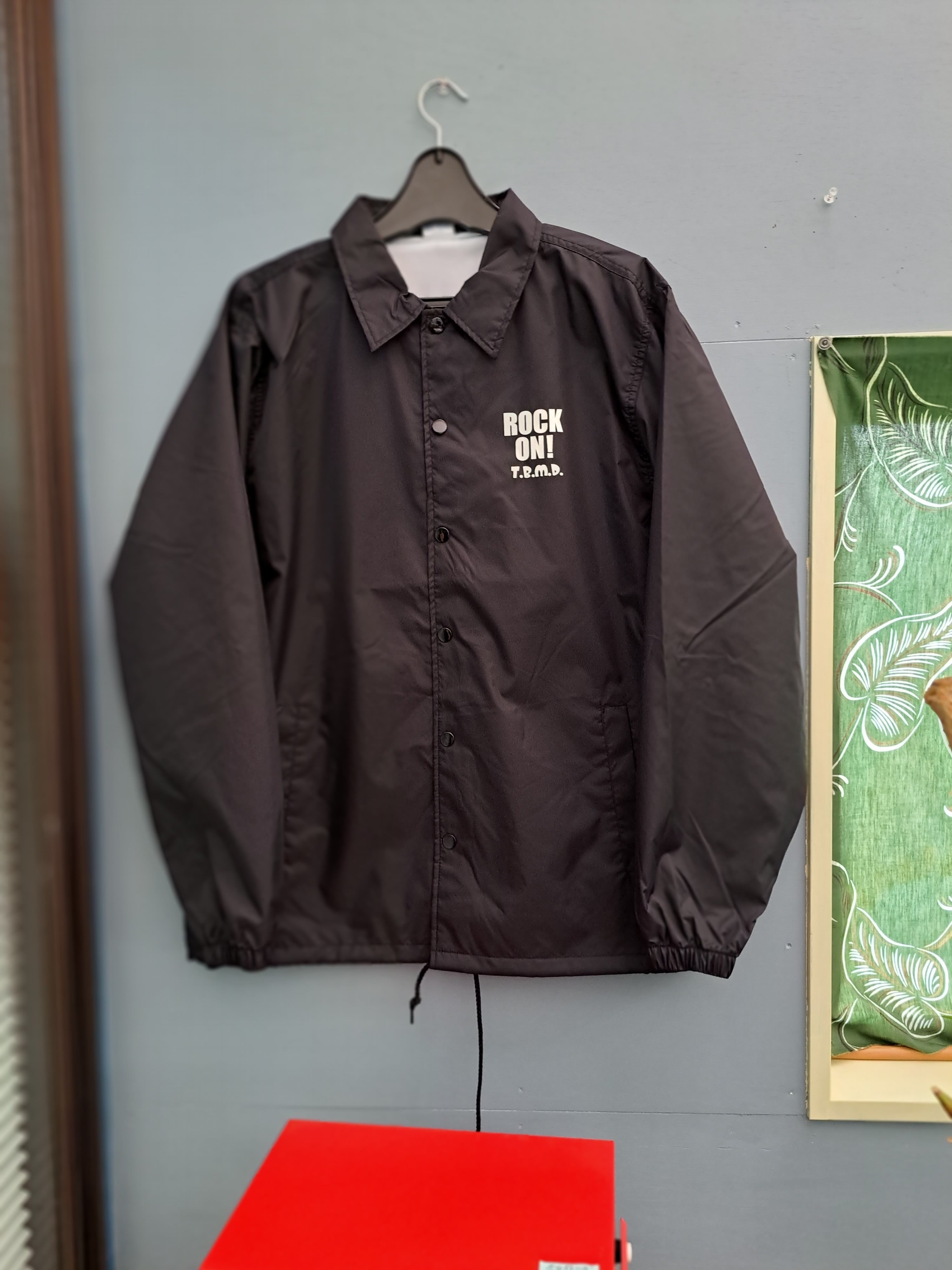 ★オリジナル ROCK ONプリント ★撥水加工/防風 ★表地→ナイロン100% 裏地→ポリエステル100% 黒地 × オフホワイト/裾フラシ サイズ→M. L.有り